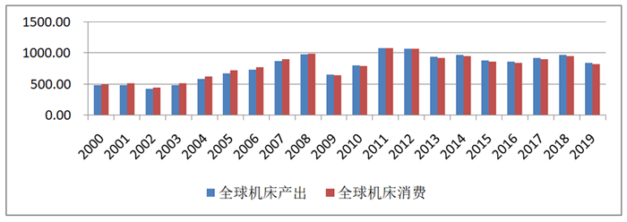 21世紀初,全球機床消費呈現高速增長趨勢,在受到2008年金融危機的沖擊快速墜落之后,迅速反彈再次高速增長,并于2011年達到歷史峰值1080.13億美元,之后進入了下降通道,2019年全球機床消費820.58億美元。期間曾出現過1次持平、2次正增長,其中1次增長持續2年。2019年的再次明顯下降,消費總額下降至2011年以來的最低點。全球機床消費持續了近10年的下降趨勢依舊。2000-2019年全球機床產出與消費情況見圖1。