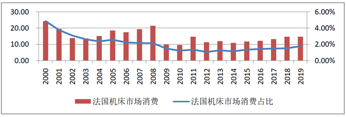 圖8 2000-2019年法國機床市場消費及其全球占比(億美元)