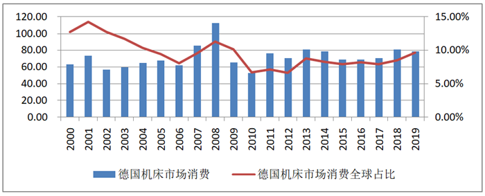 圖9 2000-2019年德國機床消費及其全球占比(億美元)