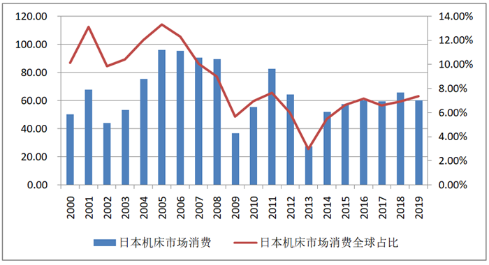 圖10 2000-2019年日本機床市場消費及其全球占比(億美元)
