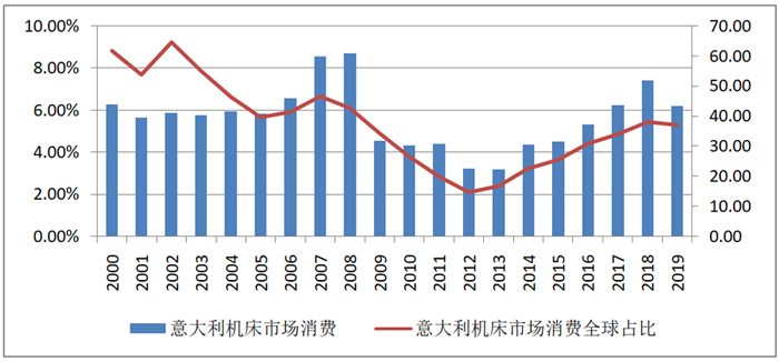 圖11 2000-2019年意大利機床市場消費及其全球占比(億美元)
