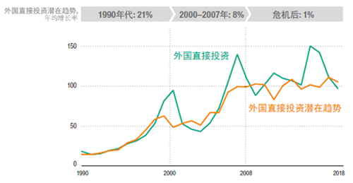 圖12 1990-2018年外國直接投資流入量和潛在趨勢