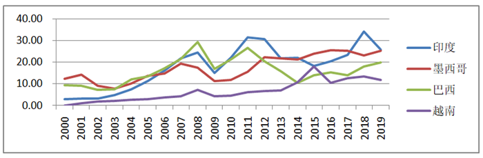 2007年以來,上述發展中國家外國直接投資總體呈現增加趨勢。其中,中國作為發展中國家吸收外國直接投資最大的國家,2012年之后,增長速度趨緩;印度吸收外國直接投資的增長速度最快;印度尼西亞吸收外國直接投資趨于穩定;越南作為后起之秀,2017年吸收外國直接投資140億美元,排在全球外國直接投資流入量第21名,2018年以160億美元排在第18名;拉美的巴西、墨西哥吸收國外直接投資的量起伏不定,但總體趨勢還是呈現增長態勢。