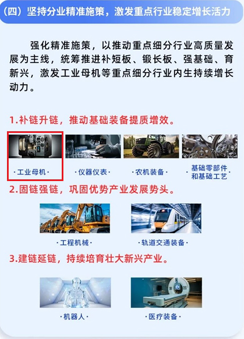 在分業(yè)精準施策方面,提出補鏈升鏈推動基礎裝備提質增效、固鏈強鏈鞏固優(yōu)勢產(chǎn)業(yè)發(fā)展勢頭、建鏈延鏈持續(xù)培育壯大新興產(chǎn)業(yè)等3個重點任務,推進工業(yè)母機、儀器儀表、農機裝備、基礎零部件和基礎制造工藝、工程機械、軌道交通裝備、醫(yī)療裝備、機器人等8個重點細分行業(yè)穩(wěn)增長。