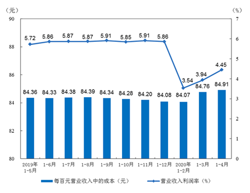 1-4月份,規(guī)模以上工業(yè)企業(yè)實(shí)現(xiàn)營(yíng)業(yè)收入28.31萬億元,同比下降9.9%;發(fā)生營(yíng)業(yè)成本24.04萬億元,下降9.1%;營(yíng)業(yè)收入利潤(rùn)率為4.45%,同比降低1.07個(gè)百分點(diǎn)。