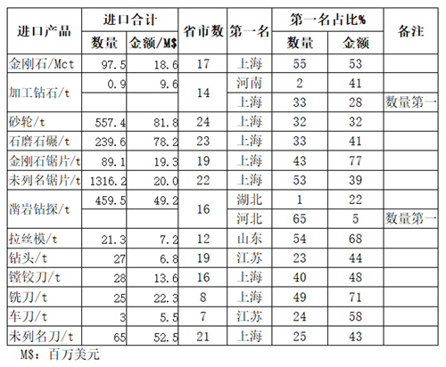 在13類進口商品中有8類都是上海排名第一,上海是最大最主要的超硬材料商品進口地。主要源于其優異的國際化營商環境吸引了國外著名超硬材料類廠商在該地設立公司或辦事機構,產品從上海入境后再分銷到其他省市。5個省市排名第一的產品分別是:河南,加工金剛石;湖北,鑿巖鉆探工具;山東:拉絲模;江蘇:鉆頭、車刀;上海:金剛石、砂輪、石磨石碾、金剛石鋸片、未列名鋸片、鏜鉸刀、銑刀、未列名刀具。