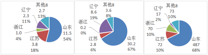 (a)數量分布(單位:噸) (b)數量分布(單位:萬件) (c)金額分布(單位:萬美元)