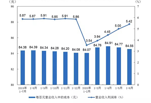 1-6月份,規(guī)模以上工業(yè)企業(yè)實(shí)現(xiàn)營業(yè)收入46.31萬億元,同比下降5.2%;發(fā)生營業(yè)成本39.16萬億元,下降4.7%;營業(yè)收入利潤率為5.42%,同比降低0.48個(gè)百分點(diǎn)。