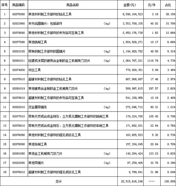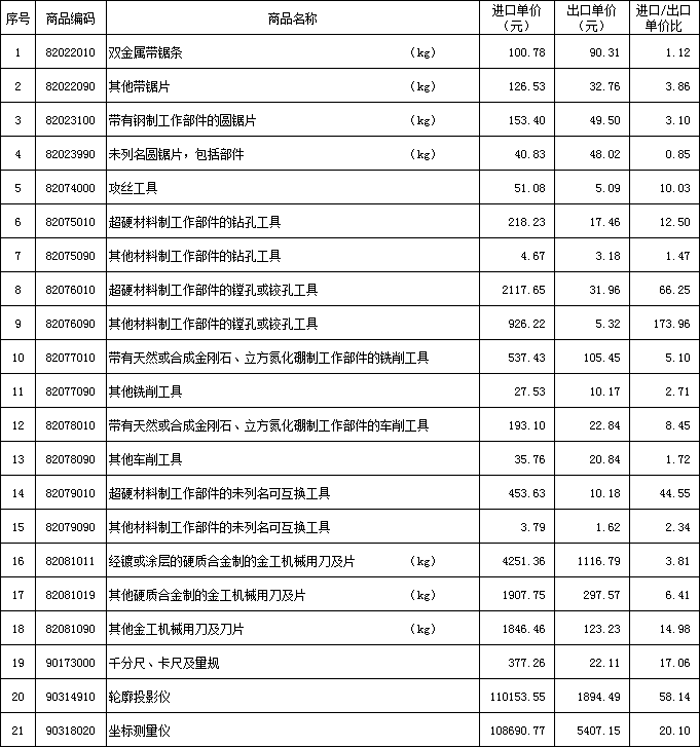 (3)附表中,在計算產品單價時,圓鋸片、刀片、帶鋸條的單位采用公斤(kg),其它類產品以件為單位。