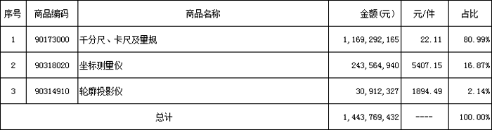 量具出口額(11.69億人民幣)遠大于進口額(3.12億人民幣),量儀出口額(2.74億人民幣)遠小于進口額(11.8億人民幣)),量具出口增長幅度遠大于進口,量儀出口增長幅度遠小于進口。