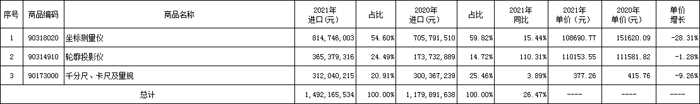 表9 2021年量具、量儀進口占比及增長