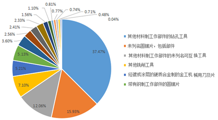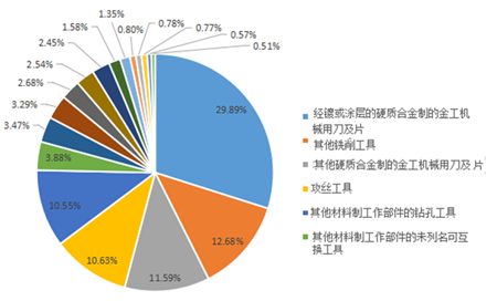 刀片(21.41億元)、銑刀(6.17億元)、攻絲工具(5.17億元)、鉆頭(5.13億元)、互換工具(1.89億元)、超硬互換工具(1.69億元)、鏜鉸刀(1.19億元)、帶鋸條(0.39億元)。