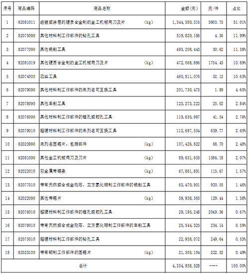 鉆頭(38.82億元),圓鋸片(20.75億元),刀片(13.38億元),互換工具(12.01億元),銑刀(9.34億元),攻絲工具(5.41億元),超硬孔加工刀具(2.89億元),帶鋸條(2.66億元),超硬互換工具(2.56億元)。