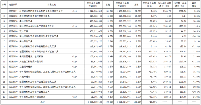 (4)2023年上半年硬質(zhì)合金刀片進出口情況