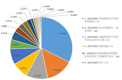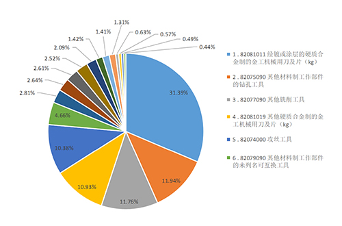 分別是:刀片(28.77億元)、鉆頭(7.74億元)、銑刀(7.62億元)、攻絲工具(6.73億元)、互換工具(3.02億元)、鏜鉸刀(1.82億元)、車刀(1.71億元)、超硬互換工具(1.69億元)。