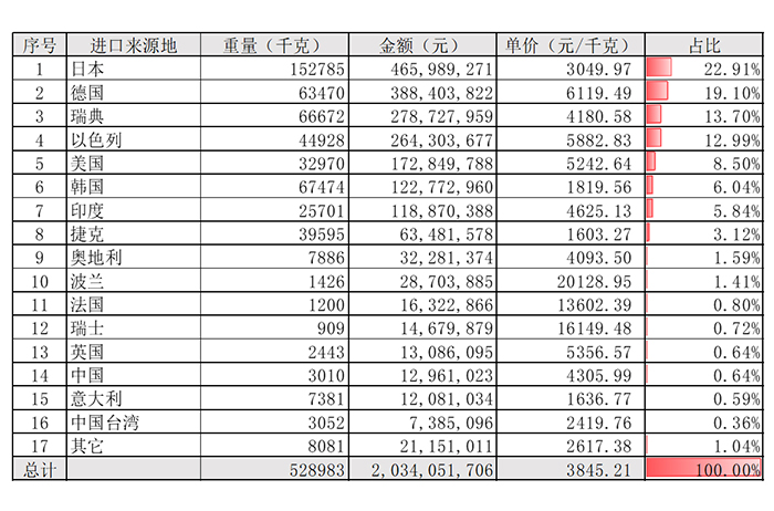 涂層刀片進口來源地(占比見表1)主要為:日本22.91%、德國19.10%、瑞典13.70%、以色列12.99%、美國8.50%、韓國6.04%、印度5.84%。非涂層刀片進口來源地(占比見表2)主要為:日本74.49%、德國9.85%、韓國6.33%、以色列1.67%、泰國1.43%、美國1.20%、盧森堡0.98%