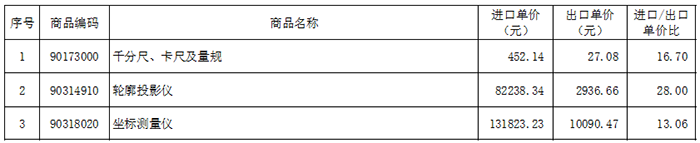 比較相同商品編碼產品,進口量具和量儀價格遠高于出口價格(表4)。