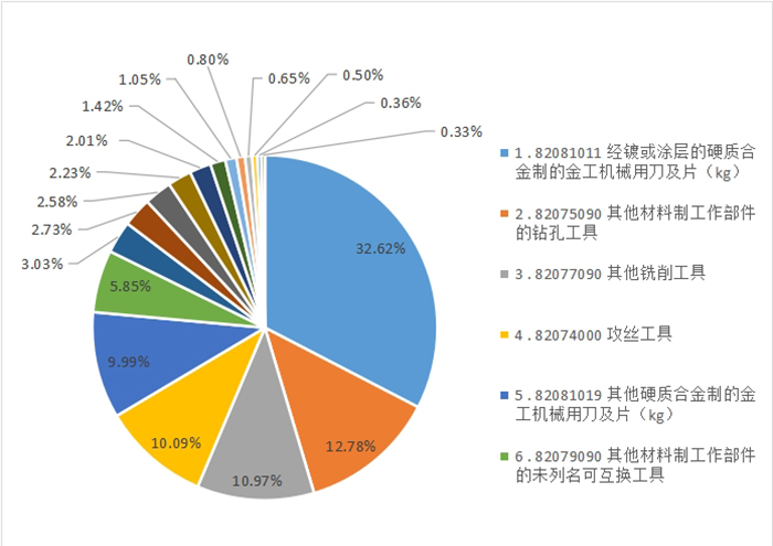 涂層刀片進口同比下降0.43%,非涂層刀片進口同比下降8.58%。超硬車刀下降39.4%,雙金屬帶鋸條下降38.9%,車刀下降18%,銑刀下降10.6%,絲錐下降4.8%,鉆頭增長4.7%,互換工具增長17.3%
