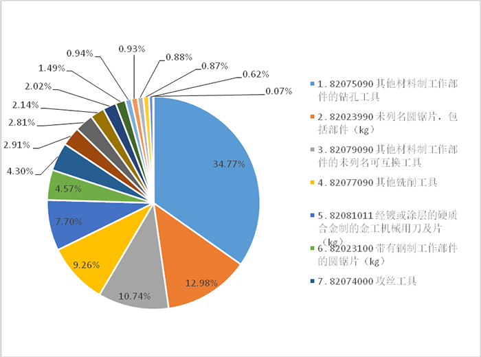 2024年刀具進口主要品種及金額分別是:刀片(38.03億元)、鉆頭(10.9億元)、銑刀(9.35億元)、攻絲工具(8.6億元)、互換工具(4.98億元)、超硬互換工具(2.58億元)、鏜鉸刀(2.2億元)。