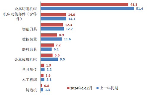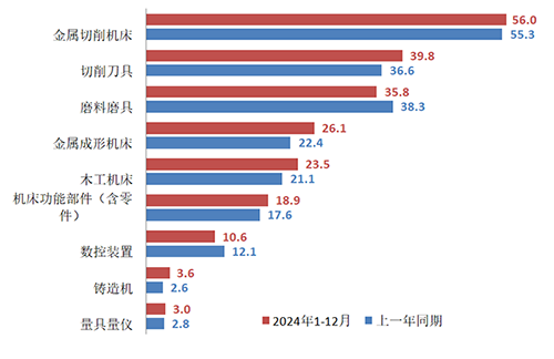 2024年,機床工具行業整體出口同比增幅較上年度擴大2.8個百分點。其中,金屬切削機床、金屬成形機床、木工機床、機床功能部件(含零件)、切削刀具、量具量儀等產品的出口都實現了增長,其中金屬成形機床和木工機床的出口更是呈兩位數增長,對行業的整體運行起到重要的支撐作用。