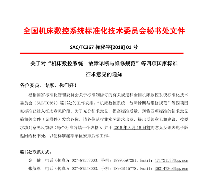 關于對“機床數控系統 故障診斷與維修規范”等四項國家標準征求意見的通知