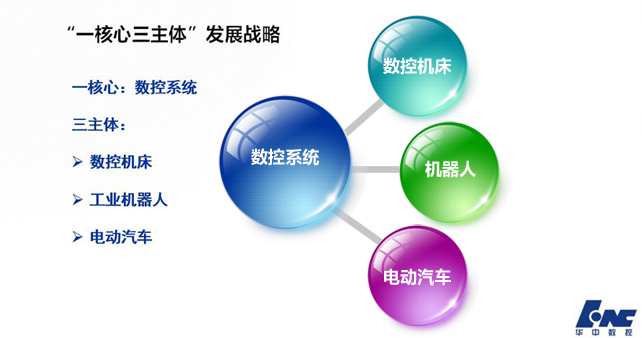 “十三五”期間,中國政府大力實施“中國制造2025”,全面推進智能制造,實現制造業轉型升級,數控系統作為各種智能裝備的“大腦”,具有廣闊的發展前景。為此,華中數控已確立了“一個核心三個主體”(如上圖)的發展戰略,立志為“用中國大腦,裝備中國制造”做出更大貢獻。