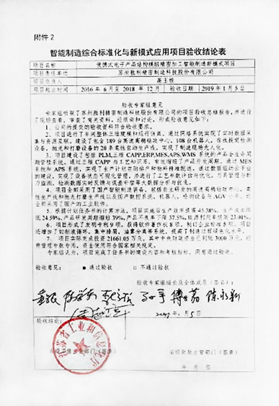 華中數控與蘇州勝利精密制造科技股份有限公司合作建設的“便攜式電子產品結構模組精密加工智能制造新模式”項目是中國制造2025智能制造示范專項。本項目綜合應用自主可控智能裝備,打造便攜式電子產品結構模組精密加工智能制造車間(如圖1所示),使用NC-Link協議原型實現了數控機床實時大數據采集功能,建成了由200臺套國產高速高精鉆攻中心、106臺套工業機器人、10臺AGV小車、20條自動輸送線、立體智能倉庫、在線視覺檢測裝備、自動化清洗與包裝線、中央生產調度控制室以及3D CAPP、PLM、MES、ERP、云數控等工業軟件組成的智能化、數字化車間。基于NC-Link標準協議及高速高精加工云服務平臺,遠程進行數據采集監控,監控診斷,大數據存儲、分析、可視化,以及可集成智能應用,生產控制中心軟件提供報表組件數﹥20,圖表類型﹥20種,支持移動端展示,平均響應時間﹤5秒。提供報表組件數﹥20,圖表類型﹥20種,支持移動端展示,平均響應時間<5秒。實現遠程實時監測故障或異常狀態的發生,在做出故障提示的同時自動給出對應的診斷維修方法指導。有效提高了公司的生產效率,滿足產品加工效果,加工效率提升25%以上。本項目于2019年初通過了江蘇省工業和信息化廳組織的現場驗收,驗收結論如圖2所示。