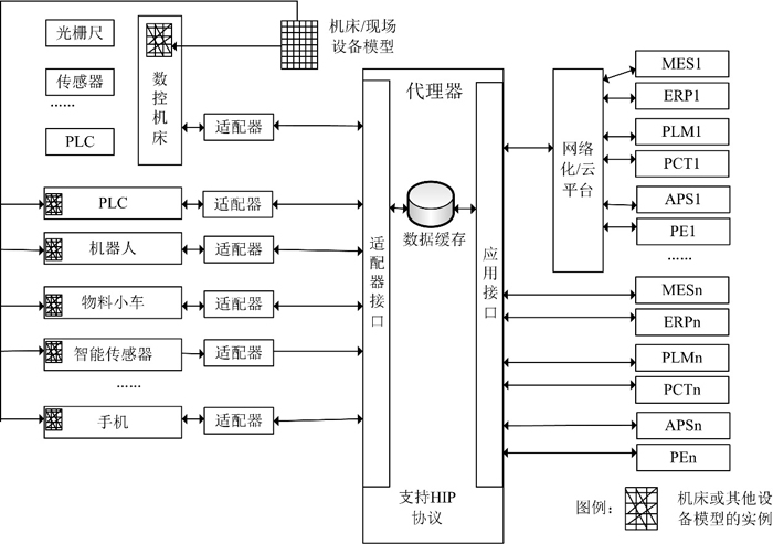 在進行數據采集時,適配器周期性地根據自己的模型結構把需要采集的批量數據通過自己的注冊接口傳遞到代理器,代理器把數據緩存在自己的存儲設備上。網絡化平臺或者云平臺將根據代理提供的接口服務去獲取代理上緩存的數據,然后應用將利用網絡平臺獲取自己所需的數據。當應用需要下發命令時,首先把命令發送的網絡平臺,在傳遞到代理,代理直接把命令通過適配器提供的接口傳遞到指定的適配器,由適配器轉發到特定的設備或數控系統。應用也可以不通過網絡化平臺直接和代理器交換數據。