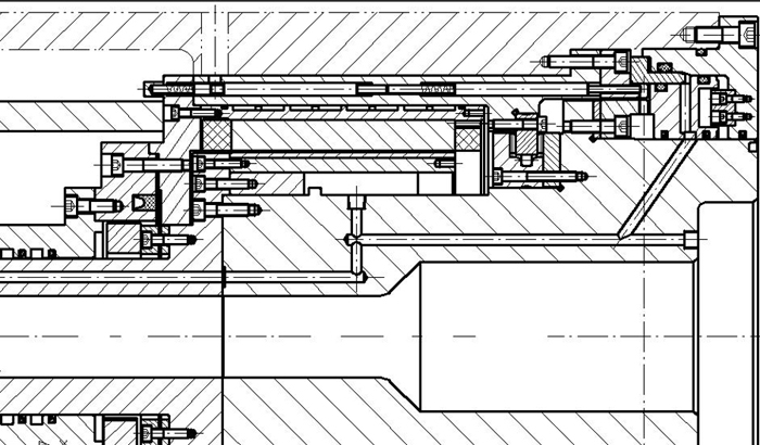 對(duì)主軸刀具高壓內(nèi)冷進(jìn)水結(jié)構(gòu)也進(jìn)行了改進(jìn),原結(jié)構(gòu)在使用一段時(shí)間后,受機(jī)加件加工精度的工作影響,存在漏水問題,影響使用壽命。將原結(jié)構(gòu)改為旋轉(zhuǎn)接頭,靠高壓水壓力自動(dòng)密封接頭,有效解決了結(jié)構(gòu)漏水,提高了使用壽命,增加密封可靠性。