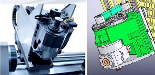 為提高B軸控制精度和響應(yīng)速度,對(duì)原有產(chǎn)品進(jìn)行升級(jí)改造,更改B軸結(jié)構(gòu),HTM63系列車銑加工中心采用力矩電機(jī)式B軸(見圖2)代替機(jī)械式B軸結(jié)構(gòu)形式(見圖3)。相比機(jī)械式B軸具有以下優(yōu)點(diǎn),傳動(dòng)鏈減少,以力矩電機(jī)結(jié)構(gòu)代替原齒輪傳動(dòng)結(jié)構(gòu),減少了減速變速、齒輪傳動(dòng)、齒輪定位等環(huán)節(jié)和零件;在保持B軸扭矩不變的情況下,提高系統(tǒng)傳動(dòng)效率及響應(yīng)速度,便于加工制造和壓縮裝配調(diào)整時(shí)間,提高裝配效率,減少裝配誤差;提高B軸動(dòng)態(tài)響應(yīng)能力,減少響應(yīng)時(shí)間,提高加工效率,增加使用可靠性和穩(wěn)定性。