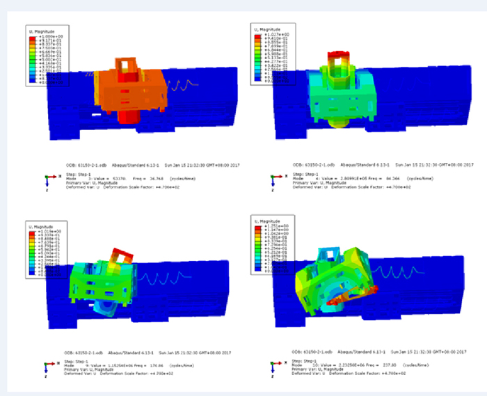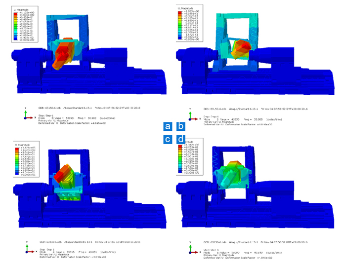 a)機(jī)床整機(jī)一階模態(tài)圖b)機(jī)床整機(jī)二階模態(tài)c)機(jī)床整機(jī)三階模態(tài)d)機(jī)床整機(jī)四階模態(tài)