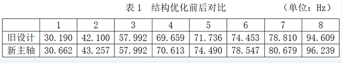 對(duì)比機(jī)床原設(shè)計(jì)動(dòng)態(tài)特性仿真分析結(jié)果以及銑主軸經(jīng)過改進(jìn)設(shè)計(jì)的機(jī)床動(dòng)態(tài)特性結(jié)果,見表1
