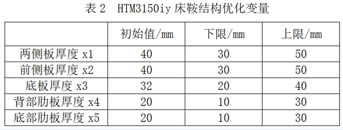 HTM3150iy的床鞍結(jié)構(gòu)研究中,進(jìn)行了結(jié)構(gòu)尺寸優(yōu)化的研究工作。如圖13所示,其中,x1為兩側(cè)板厚度,x2為前側(cè)板厚度,x3為底板厚度,x4為背部肋板厚度,x5為底部肋板厚度。其優(yōu)化變量見表2
