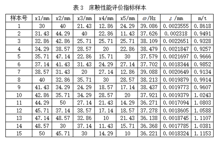 根據(jù)設(shè)計(jì)變量的變化范圍,采用拉丁超立方設(shè)計(jì)方法,使試驗(yàn)設(shè)計(jì)矩陣中各個(gè)樣本點(diǎn)因素水平分布盡可能均勻,得到15組試驗(yàn)數(shù)據(jù),并對(duì)得到的數(shù)據(jù)點(diǎn)進(jìn)行仿真,形成床鞍性能評(píng)價(jià)指標(biāo)樣本(見表3)。