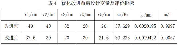 由表4可以看出,經(jīng)過優(yōu)化改進(jìn)后機(jī)床一階固有頻率提高了4.24%,最大變形量減小了3.83%,同時(shí)床鞍的質(zhì)量減輕了94kg,減少了9.4%。此次優(yōu)化在減輕了床鞍質(zhì)量的前提下,同時(shí)提高了一階固有頻率,并且降低了機(jī)床床鞍最大變形量,且結(jié)構(gòu)的靜動(dòng)態(tài)特性有所加強(qiáng),因此該尺寸優(yōu)化改進(jìn)是可行的。