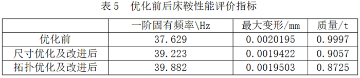 通過表5可知,進(jìn)行拓?fù)鋬?yōu)化后,機(jī)床的一階固有頻率有所提升,并且最大變形量變化很小,且比原結(jié)構(gòu)的最大變形量小,同時(shí)床鞍的質(zhì)量又減少了3.6%,達(dá)到了設(shè)計(jì)目的,因此該設(shè)計(jì)是合理的。