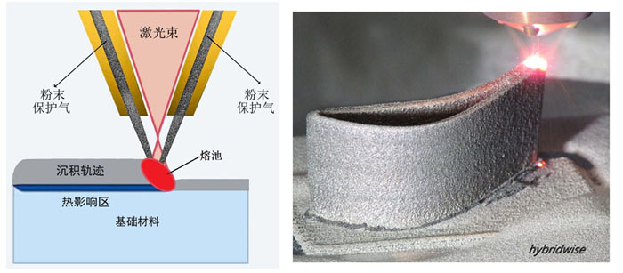 左圖-激光送粉的直接能量沉積原理圖                                        右圖-激光送粉沉積空心葉片