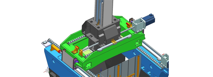 滑枕為四方向導軌,橫梁部分為“箱中箱”結構,直線軸采用雙絲杠驅動結構,保證機床長期運轉的高精度、高剛性和高穩(wěn)定性(見圖3)。