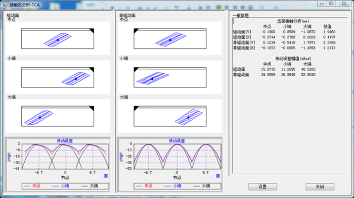 通過對擺線等高齒切齒計算原理的深入研究,完成了等高齒計算設計分析軟件。該軟件主要涵蓋了以下幾個主要模塊:齒坯計算及強度分析、調整卡計算、刀具設計與分析、基于Ease-Off的接觸區調整、輪齒數據計算和分析、齒面誤差反調、含輸入輸出接口的專家系統及數據庫系統。具體包含:不同標準的齒坯設計、基于多檔位的強度譜計算分析、適用于不同機床的多種類型的加工參數轉換、刀具形狀及副刃和凸臺干涉分析、共刀設計及分析、給定齒面點與給定安裝誤差的TCA分析、含齒深和齒厚補償功能的基于Ease-Off或目標Ease-Off的不同安裝誤差下的大輪或小輪參數的接觸區調整、齒頂厚度、齒廓形狀、運動側隙和頂隙分布、根切分析以及基于理論或標準齒面的齒面誤差反調等。