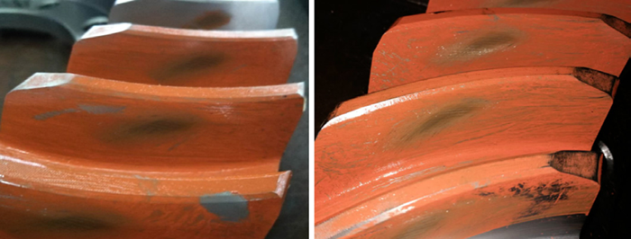 齒輪設計完成后,將數據上傳到服務器,銑齒機YKA2260讀取數據進行銑齒加工,并在測量中心Z5上檢測反調,并將反調參數傳輸到銑齒機上再次銑齒,直到齒面誤差達到要求。產品切齒合格后的齒面實際接觸區如圖6所示。