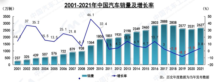 3  2001-2021年國內汽車銷量及增長率
