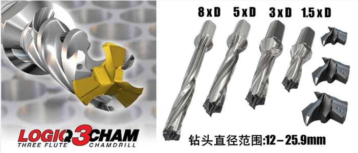 LOGIQ3CHAM具有良好的鉆頭效率和性能:鉆頭直徑范圍為12-25.9mm;長徑比1.5xD、3xD、5xD、8xD;3個有效切削刃,效率比2刃鉆頭提升50%以上;自定心鉆尖刃型設計,實現更快更高精度鉆孔加工,獲得出色的加工表面質量;優化排屑槽設計使排屑更流暢。