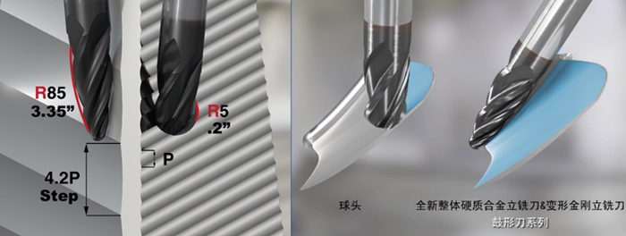曲面精銑加工傳統刀具是球頭銑刀,CAM編程軟件根據球頭部分直徑擬合計算出刀具路徑的軌跡,而每一條刀具軌跡之間的距離(步距)決定了曲面的殘留余量,這也就意味著,球頭直徑越大,和小直徑球頭銑刀相比,相同步距的情況下表面殘留越少。同理,加大步距的情況下,可以獲得和小直徑刀具相同的表面質量,而加大步距同時也就意味著加工效率的提升。隨著CAM軟件的不斷發展,刀具設定選項已不再局限于傳統的球頭銑刀,一種錐度側刃為圓弧刃口的新型銑刀選項,可以在進行曲面精加工時選擇更大的加工步距,以縮短加工時間,提升加工效率。