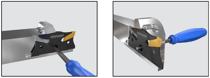 下圖為刀夾安裝在刀桿定位槽的安裝和拆卸圖片,只用同一種扳手即可輕松完成刀夾的安裝及拆卸。