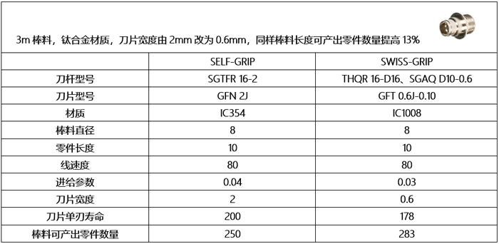 下表為2mm的GFN刀片和0.6mm新GFT切斷刀片,在切斷直徑8mm鈦合金棒料的加工參數及壽命對比。