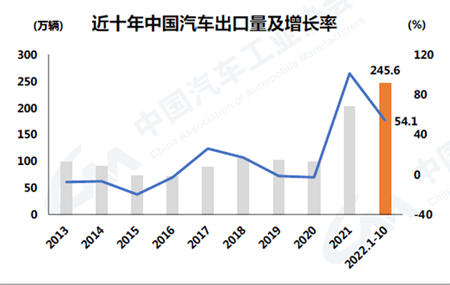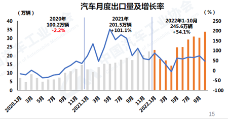 1-10月,汽車企業出口245.6萬輛,同比增長54.1%。分車型看,乘用車出口197.5萬輛,同比增長57.1%;商用車出口48萬輛,同比增長43%。新能源汽車出口49.9萬輛,同比增長96.7%
