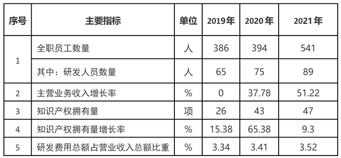 近三年企業凈資產年均增長率為78.67%,主營業務收入年均增長率29.67%,知識產權擁有量年均增長率30.02%,2022年已授權發明專利6項。公司各項指標增長態勢穩健,創新能力較強,企業成長性優良。近3年主要指標如下表所示: