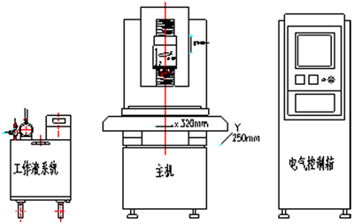 該機床共設置有5個數控軸:X、Y、W(主軸頭)、Z(電極伺服進給)、C(電極旋轉分度)。針對高檔噴絲板異形拼花高精度加工的特點,主機布局采用單立柱C型結構布局的對稱結構設計。電極及導向器自動交換系統,電極運動狀態檢測單元,電導率、溫度、壓力調控水質工作液系統,納秒級數字化微精脈沖電源,微細電加工間隙狀態快速精準檢測單元,專用微細電火花加工數控系統等單元組成。機床的整體布局及部件結構科學合理,具有足夠的剛性和精度保持性,數控軸的運動慣量分配合理、匹配,滿足電火花數控伺服加工的要求。設備饋電、工作液供給、密封防護等設計合理,運行可靠,使用安全;具有很好的人機功能、簡捷緊湊均衡,有良好的視覺效果。