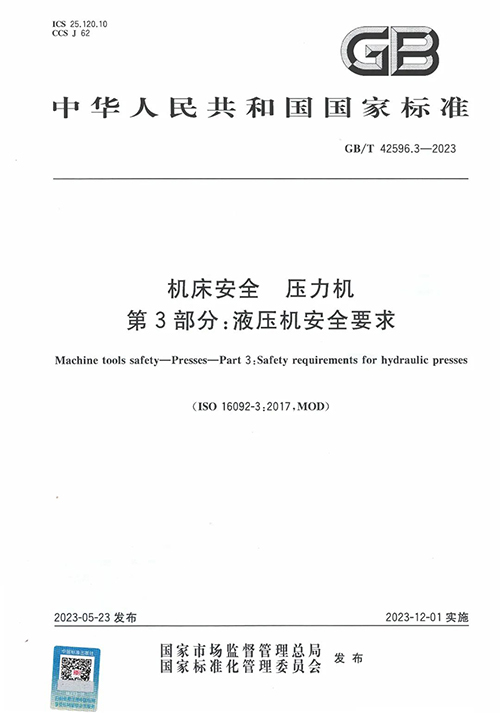 近日,國家市場監督管理總局、中國國家標準化管理委員會聯合發布2023第2號公告,由合肥合鍛智能制造股份有限公司主持制定的《機床安全 壓力機第3部分:液壓機安全要求》(GB/T42596.3-2023)國家標準正式發布,并將于2023年12月1日實施。