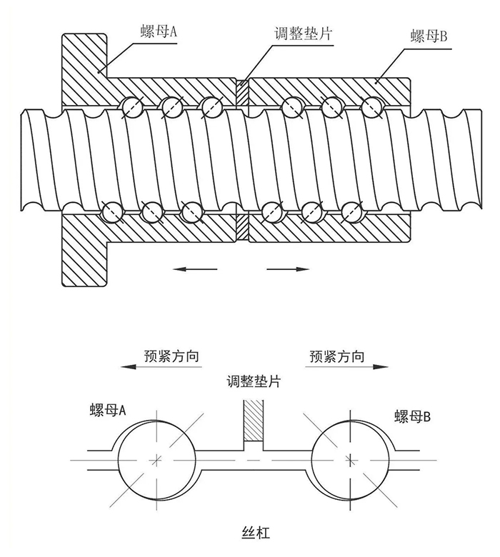 HTPM滾珠絲杠副按預(yù)緊方式分為增大鋼球預(yù)緊(Z)、雙螺母墊片預(yù)緊(D)和變位預(yù)緊(B)。此次正式完成生產(chǎn)的大型FYD6310腰返式滾珠絲杠副屬于雙螺母墊片預(yù)緊(D)方式。